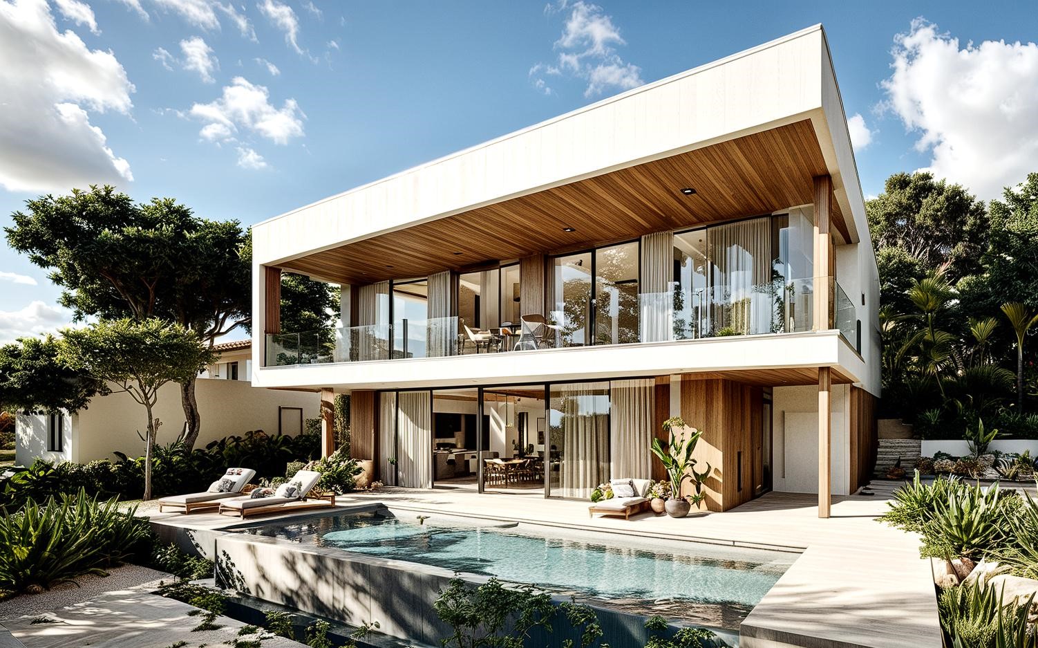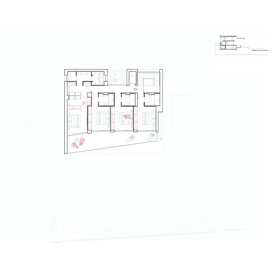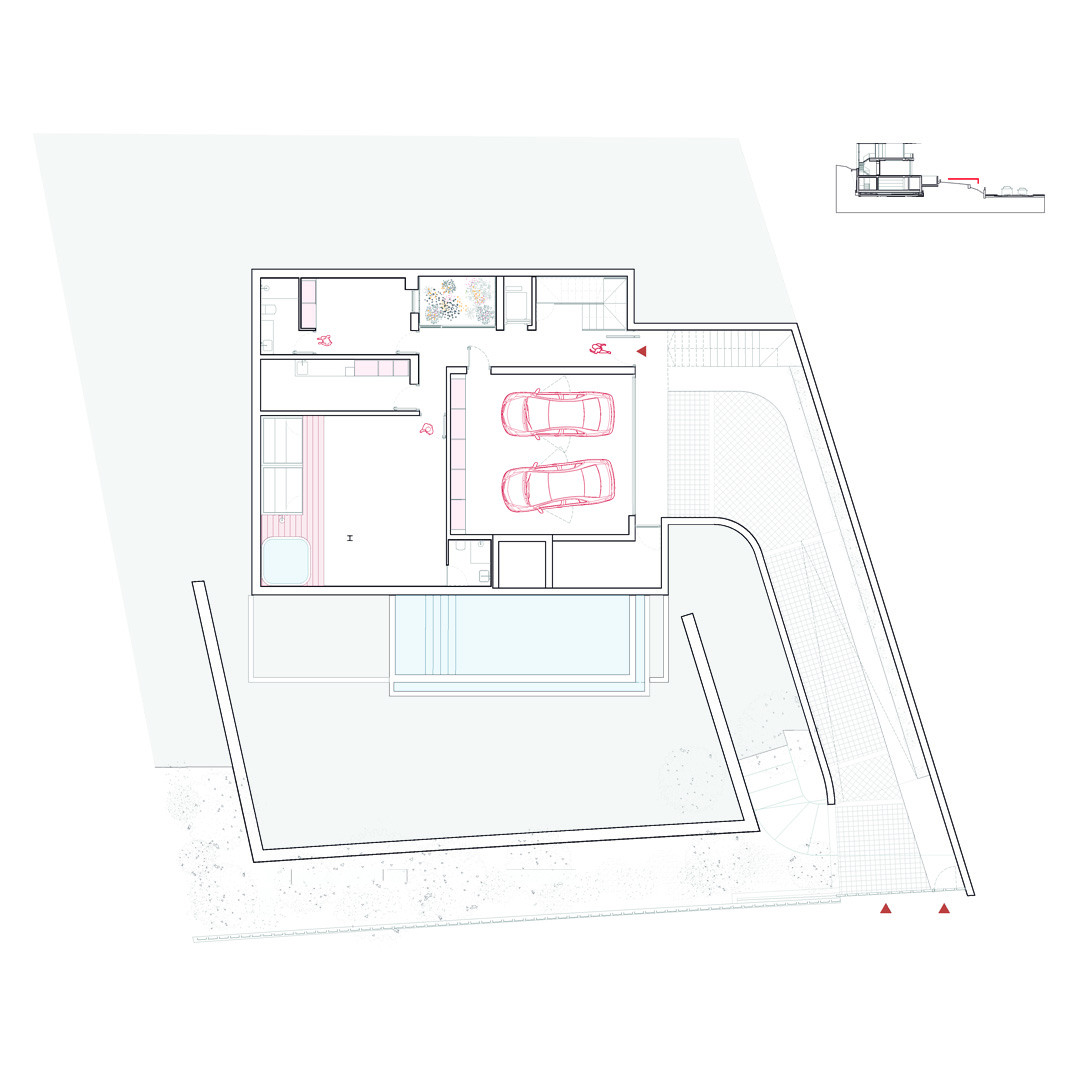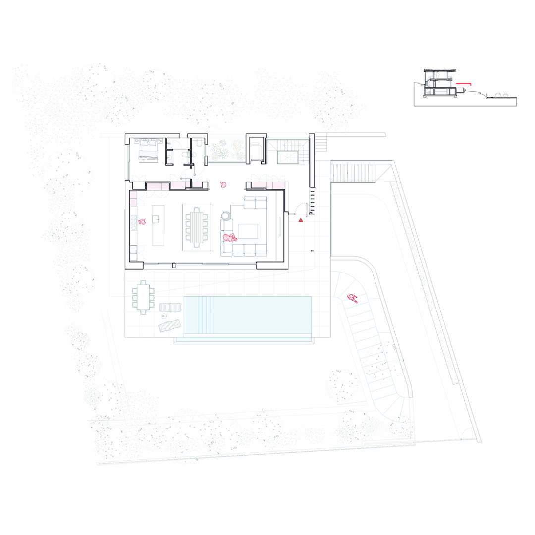 La planta baixa s’obre amb una entrada generosa presidida per l’escala que rep llum natural a través d’uns finestrals que fan connectar-te amb l’exterior. Seguint el recorregut trobem un pati interior enjardinat, que esdevé cor verd de la casa que a la vegada connecta també un espai diàfan que integra cuina, menjador i sala d’estar, integrat interior i exterior i la piscina per potenciar la vida mediterrània. A la primera planta es disposen tres suites i una habitació màster, totes orientades al mar, que garanteixen privacitat i confort sense renunciar al paisatge.